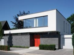 Neubau mit Fensterfront und Haustür in rot in Neuss