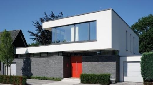 Neubau mit Fensterfront und Haustür in rot in Neuss